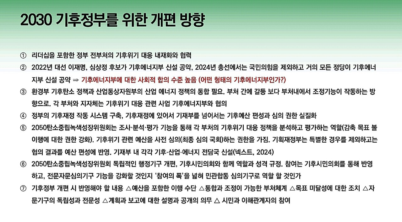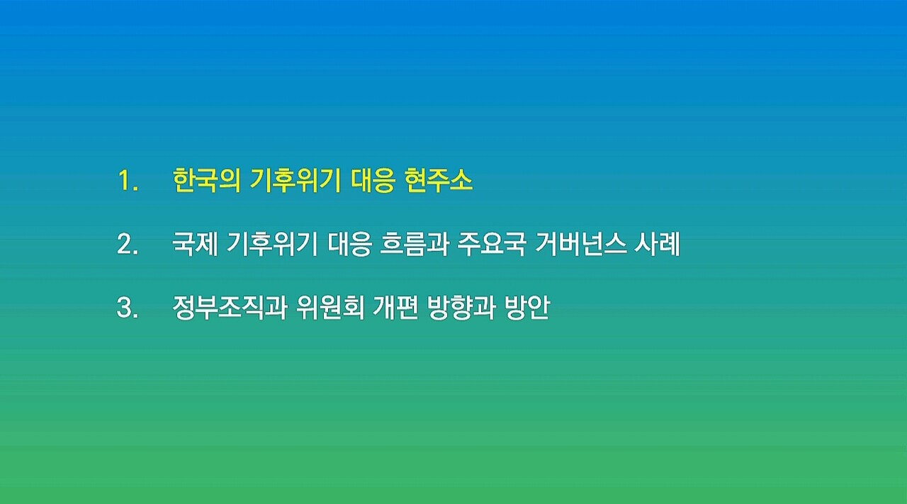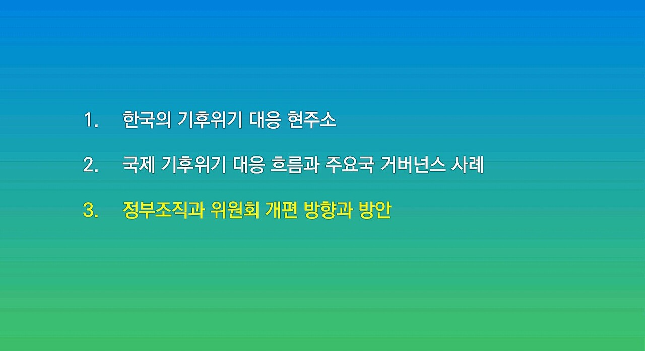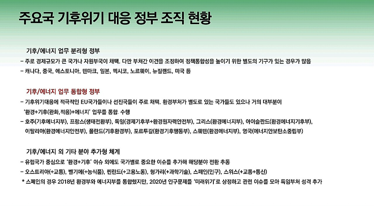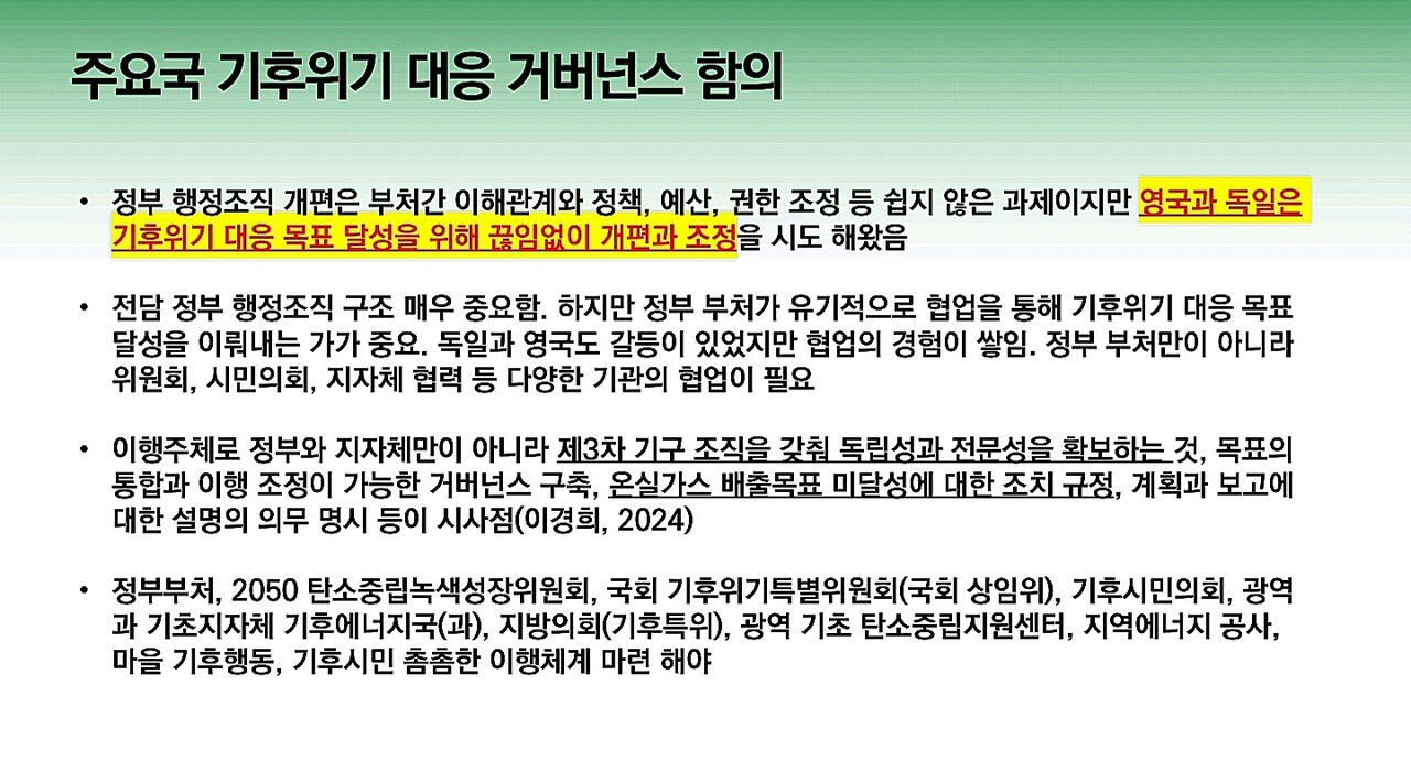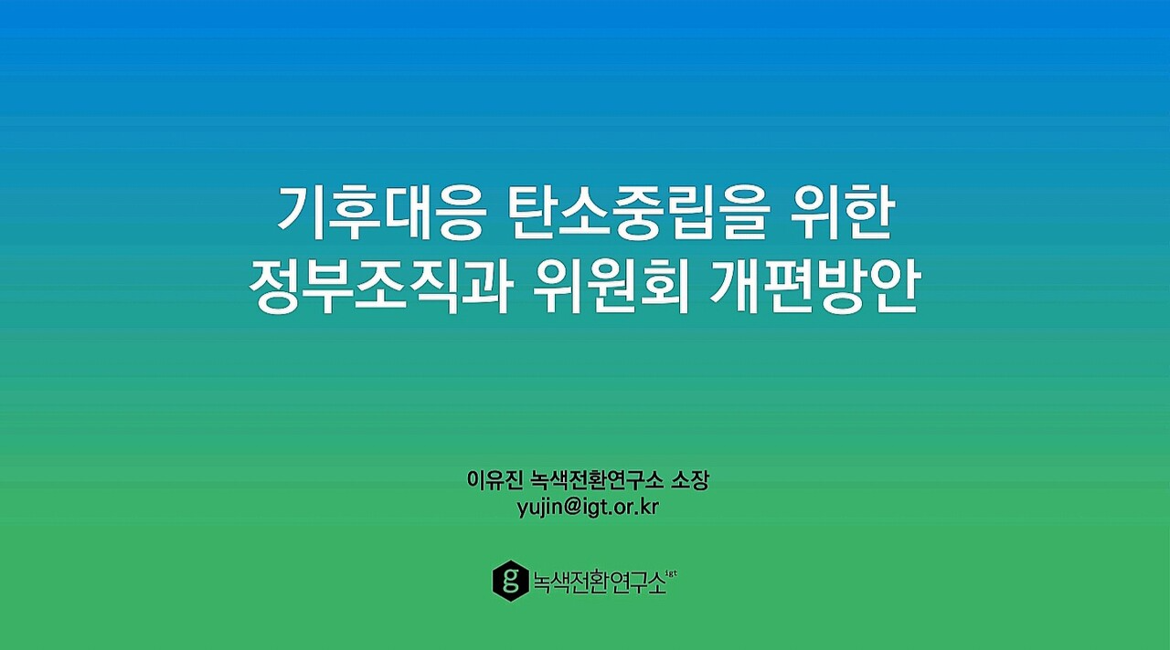 다음은 이유진 녹색전환연구소 소장이 발표한 ‘기후위기 대응 탄소중립을 위한 정부조직과 위원회 개편 방안’ 자료입니다.